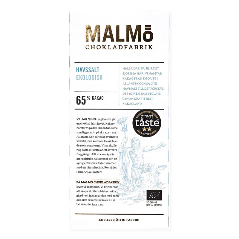 En økologisk, mørk chokolade med havsalt fra Malmö Chokladfabrik. Så lækkert! Kakaoen hentes fra den lille ø Sao Tomé, som ligger midt på ækvator ude i Atlanterhavet, mens saltet ligeledes kommer fra de store oceaner. Her flyder kraftfulde kakaotoner og en syrlig eftersmag sammen med et let saltstænk fra havet.